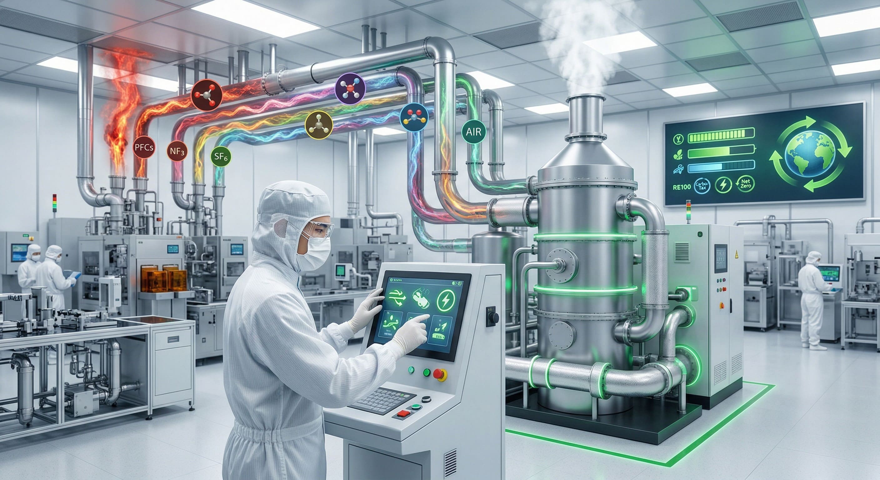 全球供應鏈正快速邁向淨零碳排,RE100 與各國碳邊境稅的推行,使半導體製造業面臨前所未有的環保法規壓力。在晶圓製造過程中,為維持先進製程的良率與穩定性,無可避免地須使用大量具備高全球暖化潛勢的溫室氣體,例如全氟化合物、三氟化氮以及六氟化硫。這些氣體若未經妥善處理直接排放,將對環境造成不可逆的衝擊。